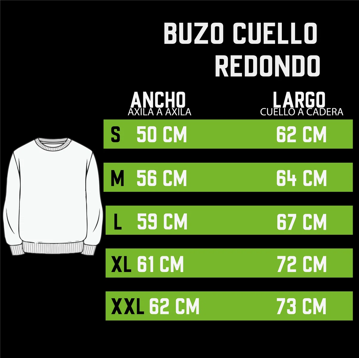 Estas medidas toman el ancho de sisa a sisa (axila a axila) y largo de hombro hasta finalizar la prenda. De este modo, podes tomar las medidas de una prenda, y corroborar cuál es el talle que te gustaría. (La medida la tomas desde una prenda, no el cuerpo)