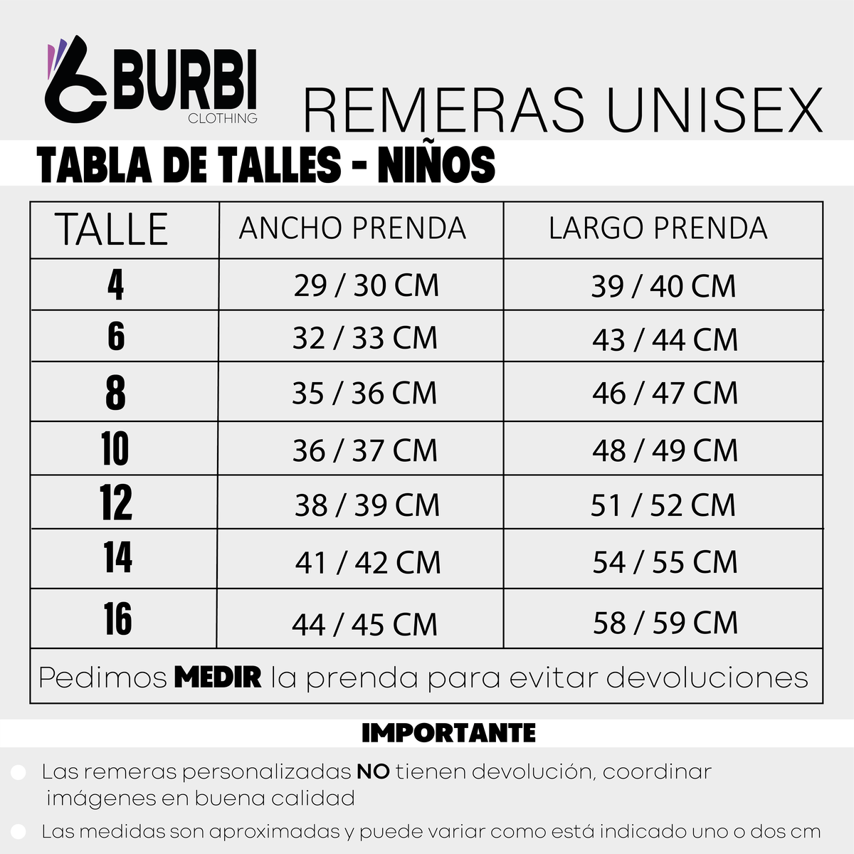 Las medidas son aproximadas, pueden variar 1 ó 2 cm dependiendo la tanda.
